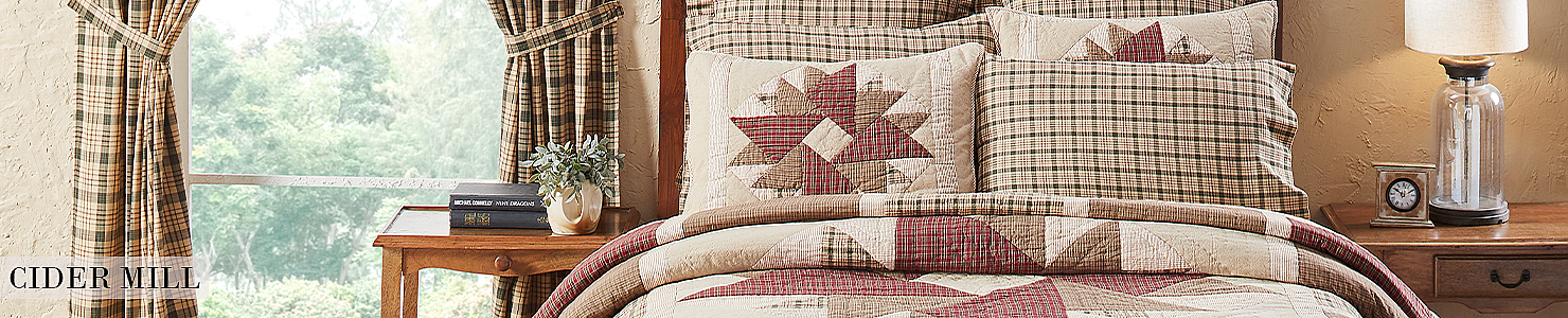 Home Collections Cider Mill 1-24 of 29 results for Cider Mill FILTER Sort by: Bestsellers SKU Featured Items Sale Price Bestsellers Most Viewed Cider Mill Standard Sham 21x27 Item ID: 80322 Qty Available: Available $33.95 Cider Mill King Sham 21x37 Item ID: 80321 Qty Available: Available $44.95 Cider Mill Plaid Panel Set of 2 84x40 Item ID: 80329 Qty Available: Unavailable $89.95 Cider Mill Fabric Euro Sham 26x26 Item ID: 80320 Qty Available: Available $27.95 Cider Mill Queen Quilt 90Wx90L Item ID: 80315 Qty Available: Available $208.95 Cider Mill Plaid Valance 16x60 Item ID: 80339 Qty Available: Available $28.95 Cider Mill Plaid Tier Set of 2 L36xW36 Item ID: 80335 Qty Available: Available $48.95 Cider Mill Plaid Valance 16x72 Item ID: 80338 Qty Available: Available $30.95 Cider Mill King Pillow Case Set of 2 21x40 Item ID: 80323 Qty Available: Available $33.38 Cider Mill Standard Pillow Case Set of 2 21x30 Item ID: 80324 Qty Available: Available $27.46 Cider Mill King Quilt 105Wx95L Item ID: 80314 Qty Available: Available $229.95 Cider Mill Queen Bed Skirt 60x80x16 Item ID: 80318 Qty Available: Available $63.95 Cider Mill Plaid Valance 16x90 Item ID: 80337 Qty Available: Available $33.95 Cider Mill Plaid Door Panel 72x40 Item ID: 80328 Qty Available: Available $37.95 Cider Mill Plaid Tier Set of 2 L24xW36 Item ID: 80336 Qty Available: Unavailable $36.95 Cider Mill Plaid Prairie Long Panel Set of 2 84... Item ID: 80331 Qty Available: Available $59.95 Cider Mill King Bed Skirt 78x80x16 Item ID: 80317 Qty Available: Available $74.95 Cider Mill Luxury King Quilt 120Wx105L Item ID: 80313 Qty Available: Available $259.95 Cider Mill Plaid Prairie Swag Set of 2 36x36x18 Item ID: 80333 Qty Available: Available $39.95 Cider Mill Plaid Short Panel Set of 2 63x36 Item ID: 80330 Qty Available: Available $71.95 Cider Mill California King Quilt 130Wx115L Item ID: 80312 Qty Available: Available $279.95 Cider Mill Olde Farmhouse Pillow 18x18 Item ID: 80326 Qty Available: Unavailable $36.95 Cider Mill Primitive Pig Pillow 14x18 Item ID: 80325 Qty Available: Available $37.95 Cider Mill Plaid Prairie Short Panel Set of 2 6... Item ID: 80332 Qty Available: Available $52.95 12